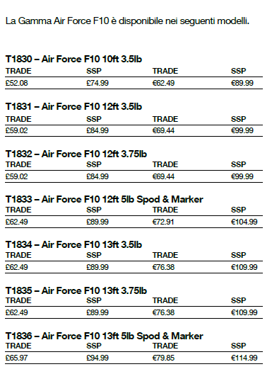 Le canne Air Force F10 costituiscono il fondamento della famiglia di canne Air Force, offrendo un modello di ingresso altamente raffinato in una gamma orientata alle prestazioni, apprezzata dai carpisti di tutta Europa. Posizionata al di sotto delle serie F20 e F40, la F10 è stata sviluppata per offrire il vero DNA di lancio Air Force in una configurazione più accessibile, senza compromessi dove serve. Il cuore della F10 è un blank in carbonio di alta qualità a basso contenuto di resina, progettato per produrre un’azione leggera e di recupero rapido con una sensazione pulita e reattiva. Questa costruzione raffinata fornisce le riserve di potenza necessarie per lanci a lunga distanza e ripetuti, mantenendo al contempo un feedback eccellente attraverso il blank durante il combattimento. Ogni canna presenta una finitura opaca antiriflesso con fibbie nere lucide e un marchio Air Force minimale, creando un’estetica moderna e sobria. Un porta mulinello Fuji posizionato con precisione e giunture color canna di fucile, migliorando l’efficienza di lancio, abbinato a una discreta line-clip Nash posizionata direttamente davanti al porta mulinello per una gestione pratica e uniforme del filo. Gli anelli Seaguide TDG a doppio ponte con rivestimento Adaman garantiscono un flusso di lenza fluido, durata e resistenza alla corrosione, mentre la spaziatura degli anelli attentamente studiata offre una distribuzione equilibrata del carico e un migliore controllo del lancio. Completate da guaina termoretraibile giapponese e da raffinati dettagli ergonomici sul calcio, le canne Air Force F10 sono progettate per prestazioni pulite, lanci efficienti e resistere a un utilizzo intensivo. Disponibili nelle misure 10 piedi, 12 piedi e 13 piedi.